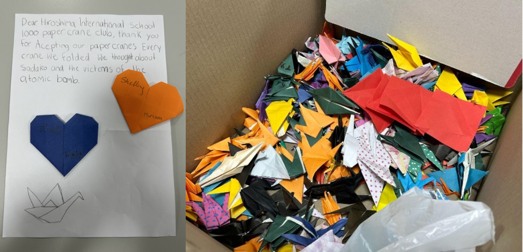 根據廣島國際學校的表示,千羽鶴社團的活動始於1985年,當時作為和平教育的一環,來自美國和加拿大的學校寄送紙鶴。最初是一次性的活動,由學生自發性集結,將紙鶴用繩子串連並奉獻到和平紀念公園。然而,這項活動後來在學生的推動下,發展成為一個全年進行的自發性和平活動。目前,約有 40 名來自國中二年級到高中三年級的學生參,他們分別來自日本、韓國、烏克蘭等10個不同國家背景。