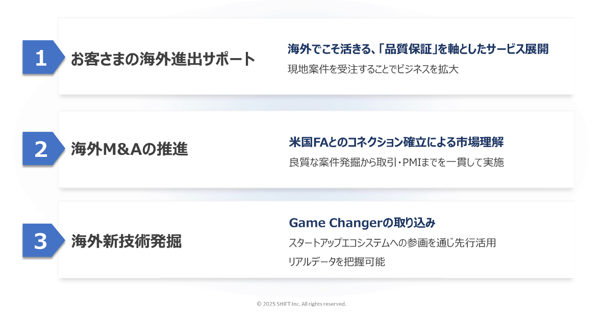 JSTORIES:なるほど。そうした中で、先日、SHIFTは米国企業2社との業務提携とSHIFT USAの設立を発表しました。いよいよ海外展開に向けて具体的に動き出したようですね。