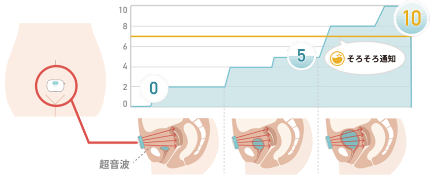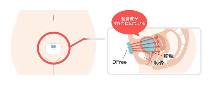 該公司開發販售的「DFree」是無線小型感測設備,穿戴在下腹部,由4個方向發出的超音波分10個階段測量顯示尿液蓄積狀況的膀胱膨脹程度,並透過智慧型手機等通知應準備排尿的時機。