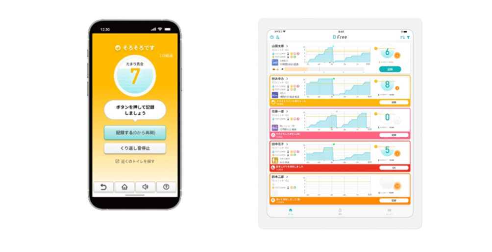 為減輕這項負擔,有家公司運用獨創感測設備將排尿時機視覺化,正逐步擴大市場。這家公司名為DFree(東京都港區,代表董事中西敦士),名稱寓意讓高齡者等從尿布(Diaper)中解放(Free)。