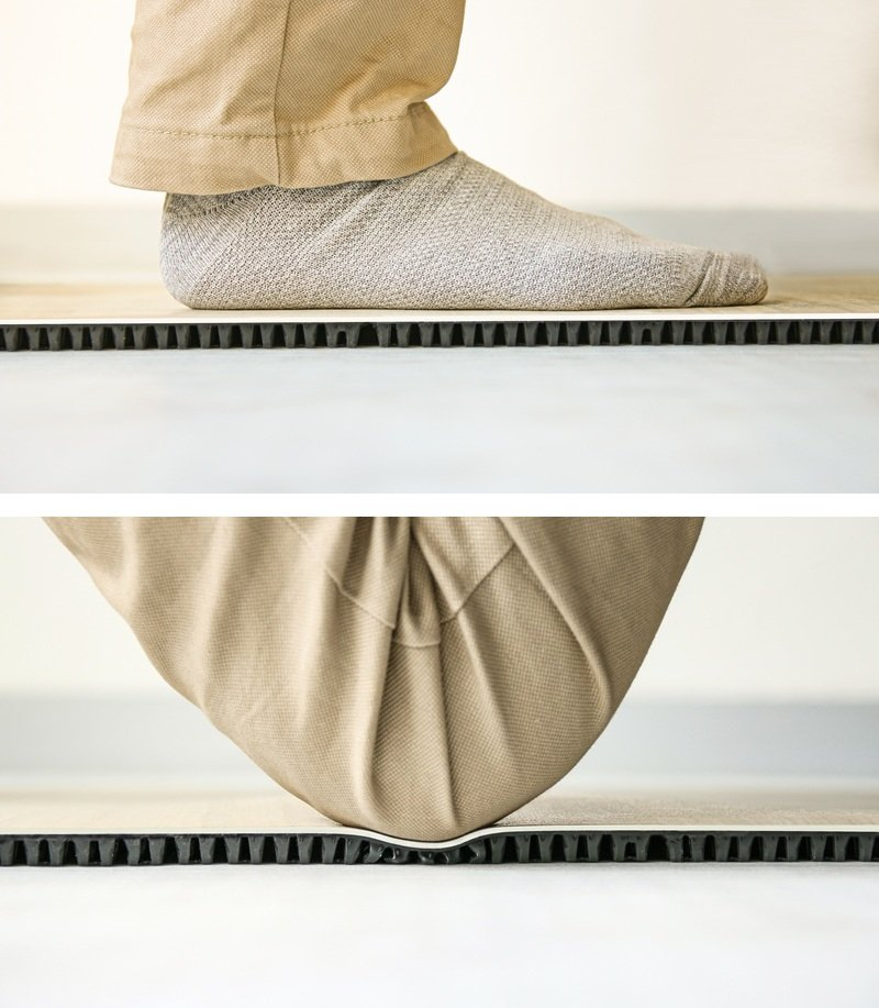 長年の研究開発の結果、Magic Shieldsの床材は衝撃を受けた時だけクッションが沈み込むように作られたため、利用者は通常の動きでは足元の違いに気付くことなく、自由に歩いたり寝転がったり立ったりすることができる。藤田医科大学や名古屋大学と共同で行った臨床研究で、この技術の可能性が確認された。下村氏は「私たちのデータでは、柔軟性と剛性を併せ持つメカニカル・メタマテリアルの床材は、衝撃吸収性のあるタイルカーペットと比べて大腿骨にかかる衝撃力を約43%軽減し、しかも歩行やバランスには影響を与えないことが示されています」と話す。