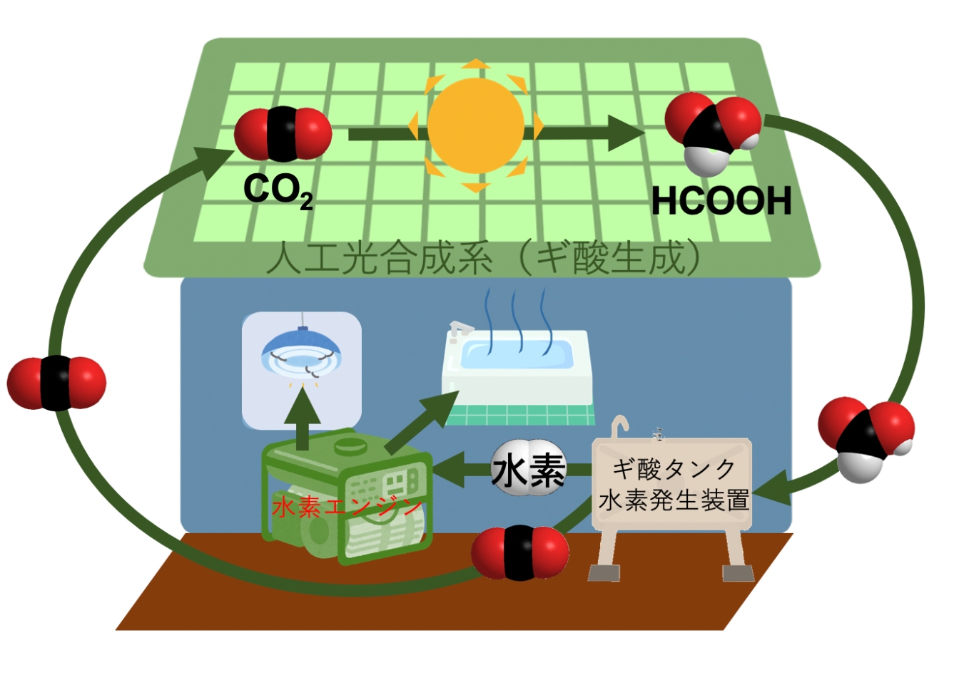 人工光合成技術はすでに政府、大学、産業界などが一体となって、様々な分野で研究が行われている。飯田GHDと大阪市立大学人工光合成研究センターは2015年に共同研究部門を設立。太陽光エネルギーから生成・貯蔵した「ギ酸」から水素を作る人工光合成技術と、生成した水素を使って高効率で発電する技術を開発した。