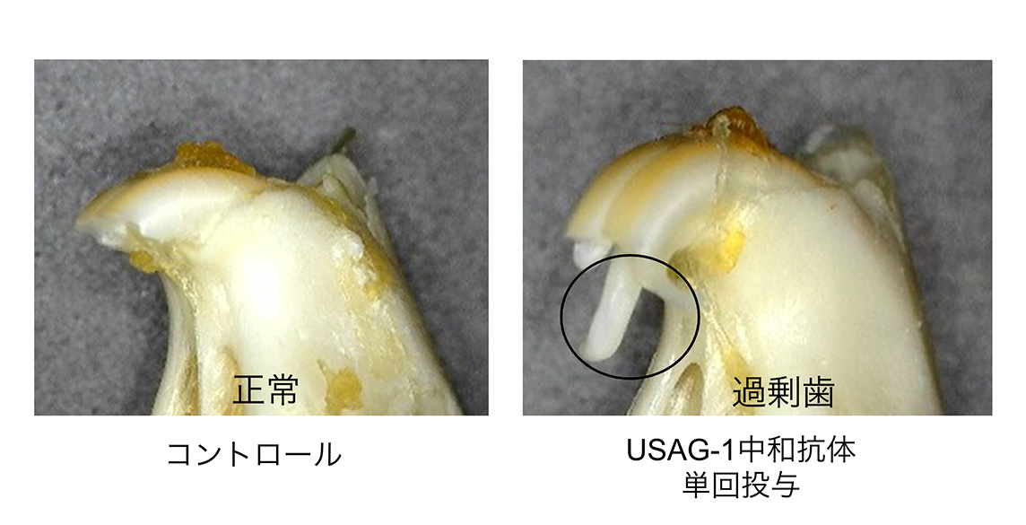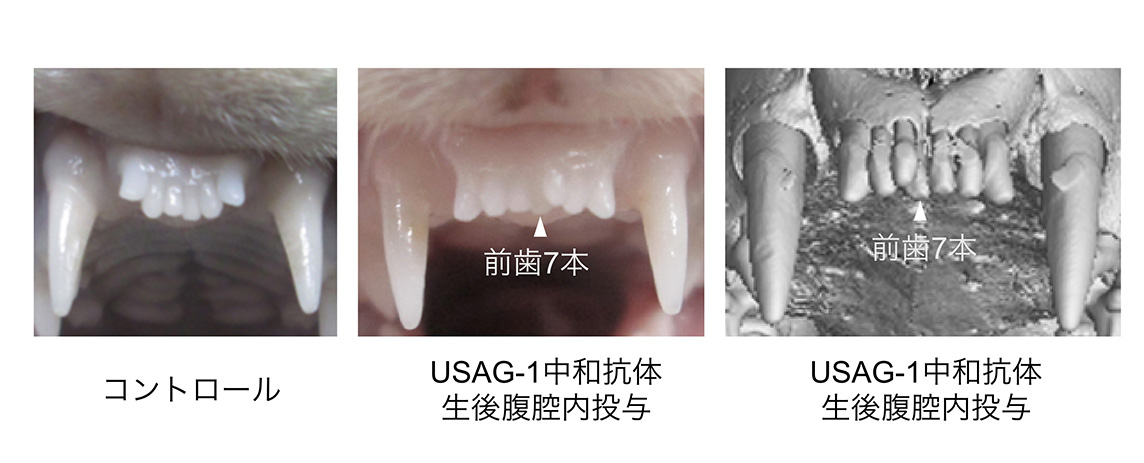 USAG-1遺伝子が欠損したマウスは、通常は退化して消失する「歯の芽」が退化しない。それを突き止めた高橋さんらは、USAG-1タンパク質の働きを抑える抗体を投与することで歯を生やす実験に成功した。
