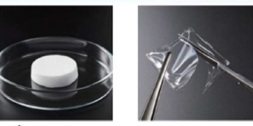 The photo on the left shows the Silk-Elastin Wound Healing Sheet. It can be processed into various forms such as sponges and films. Photo courtesy of Sanyo Chemical Industries (same below).