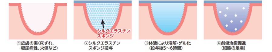 When the Silk-Elastin wound sheet is applied to damaged skin, the sheet dissolves in bodily fluids and forms a gel at body temperature. The resulting gel adheres closely to the wound, maintains a moist environment, and suppresses bacterial growth.
