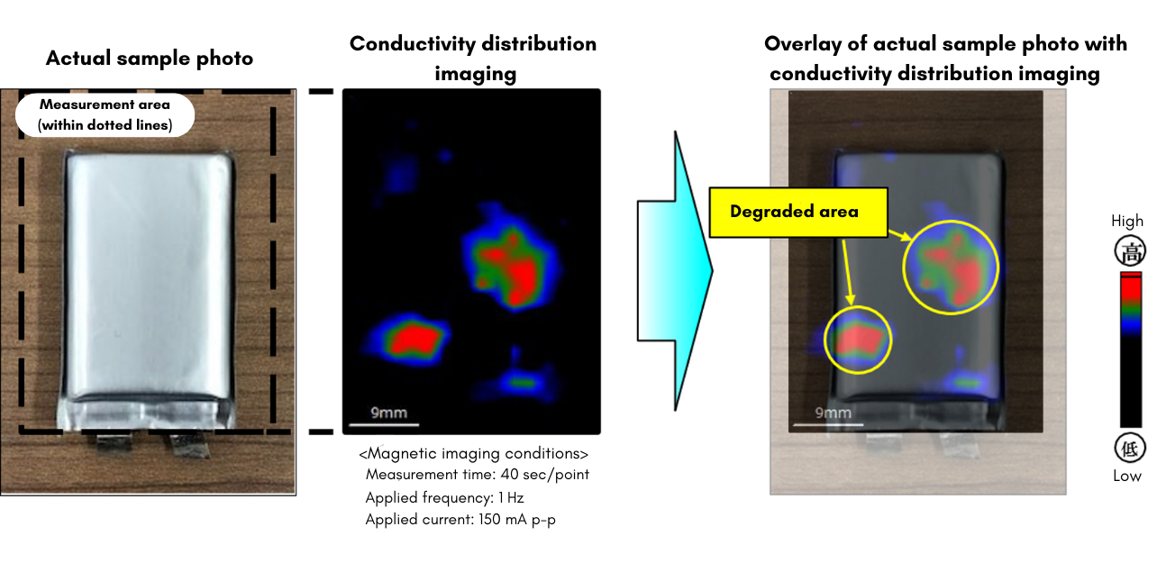 Kimura developed a method to measure magnetic field distribution using ultra-sensitive sensors and then reverse-calculate the internal currents — a technique known as solving the inverse problem. After years of work, he succeeded in producing images showing exactly where current concentrates inside a battery.