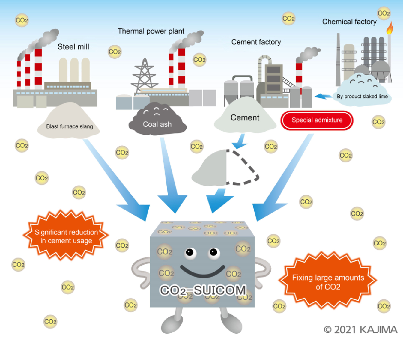 In 2008, Japanese construction company Kajima Corp. developed and put to practical use the world’s first carbon-negative concrete, CO2-Suicom. Since then, the product’s use has increased, including as small paving blocks for architectural construction.