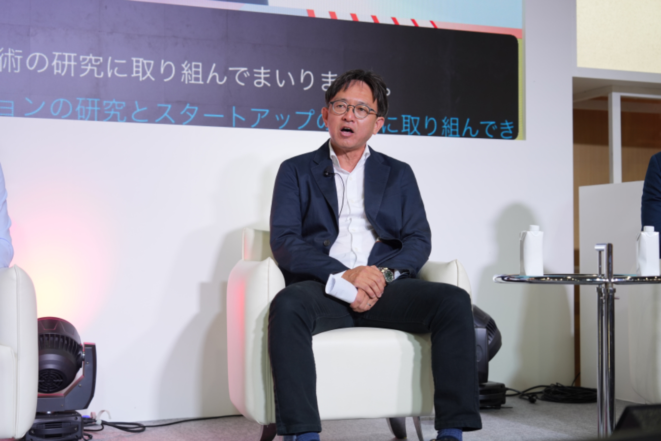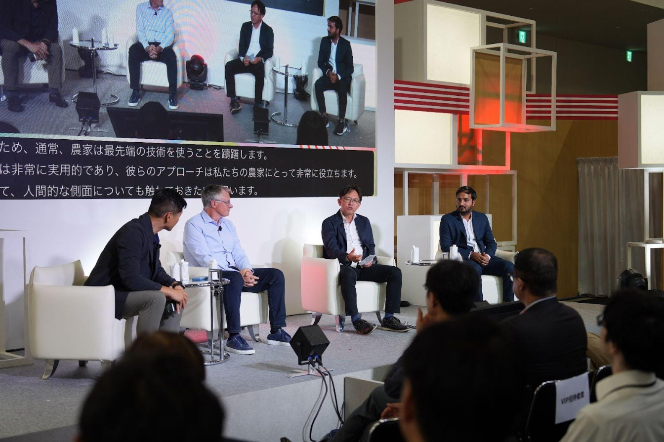 2025年9月、「Global Startup EXPO 2025」のパネルディスカッションに登壇した(左から)NEC Xの森田信之さん、SVG Ventures | THRIVEのジョン・ハートネットさん、カゴメの上田宏幸さん、EF Polymerのナラヤン・ラル・ガルジャールさん   写真撮影:Moritz Brinkhoff | JStories (以下同様)