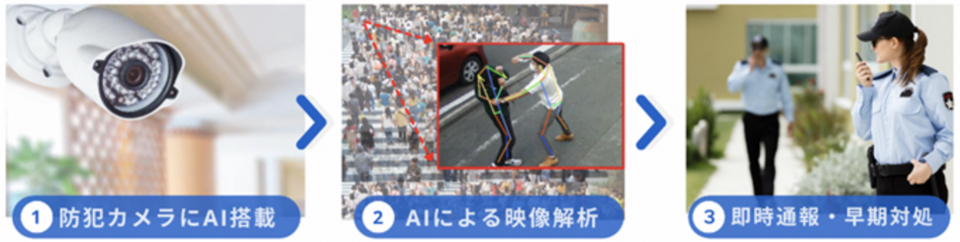 同システムを提供しているのは、行動認識AIを独自開発しているアジラ(本社:東京都町田市、木村大介(Kimura Daisuke)代表取締役社長)。同社のAI警備システム「アジラ」は、防犯カメラがとらえた人々の行動をAIが自律学習し、通常とは異なる「違和感」のある動きを予期しない危険行動として即時に通知し、事件・事故の未然防止につなげる。