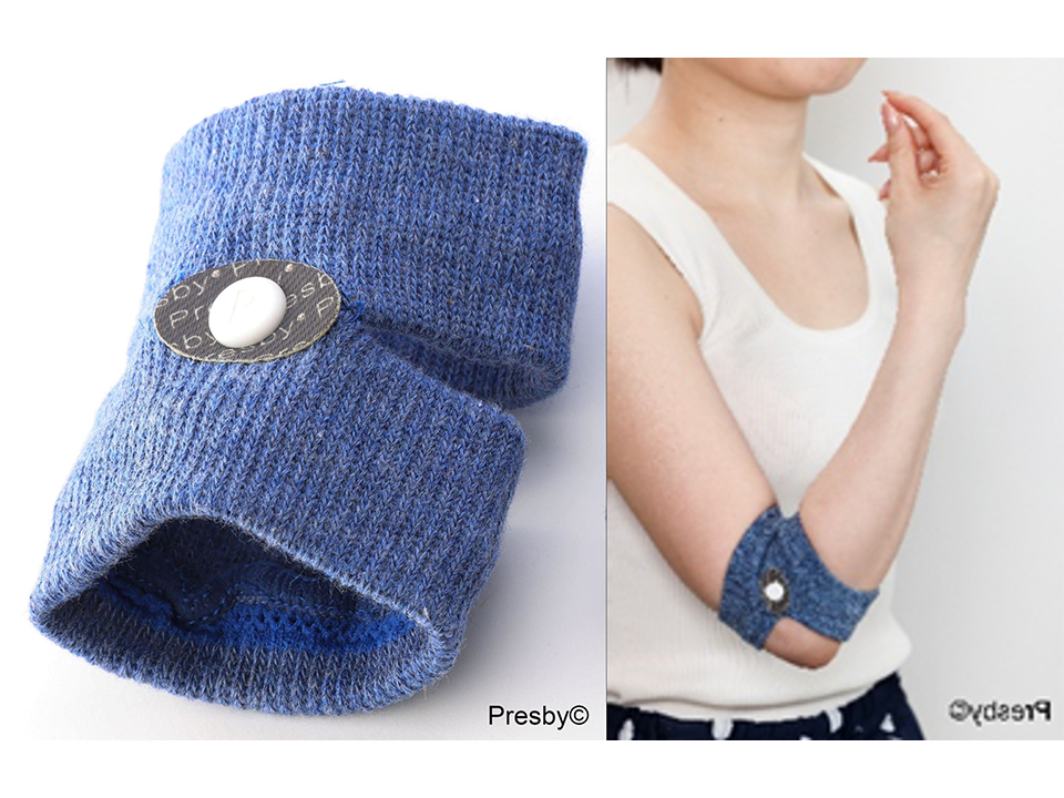 花粉症用は肘に装着するタイプで、バンドについているボタンが曲池(きょくち)というツボを刺激する。適度な着圧があるため、あえてツボ押しをせずとも、着けているとバンドの圧力で指圧状態を維持できる。同社によると、曲池の刺激は免疫力を高めるほか、鼻や喉などの粘膜病変や呼吸器疾患の改善も促し、鼻水やくしゃみなどの症状を緩和できるという。