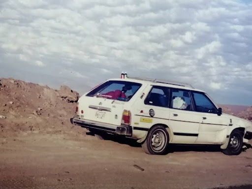 「ヤマト」と命名された、米国留学中に乗っていた古いスバルのステーション・ワゴン。車軸やギア、冷却装置などが何度も壊れながらも、米国からアルゼンチンまでの16,000kmを陸路で走り切った。写真は、ペルーからアルゼンチンに向かう途中のチリの高山地帯の山道で