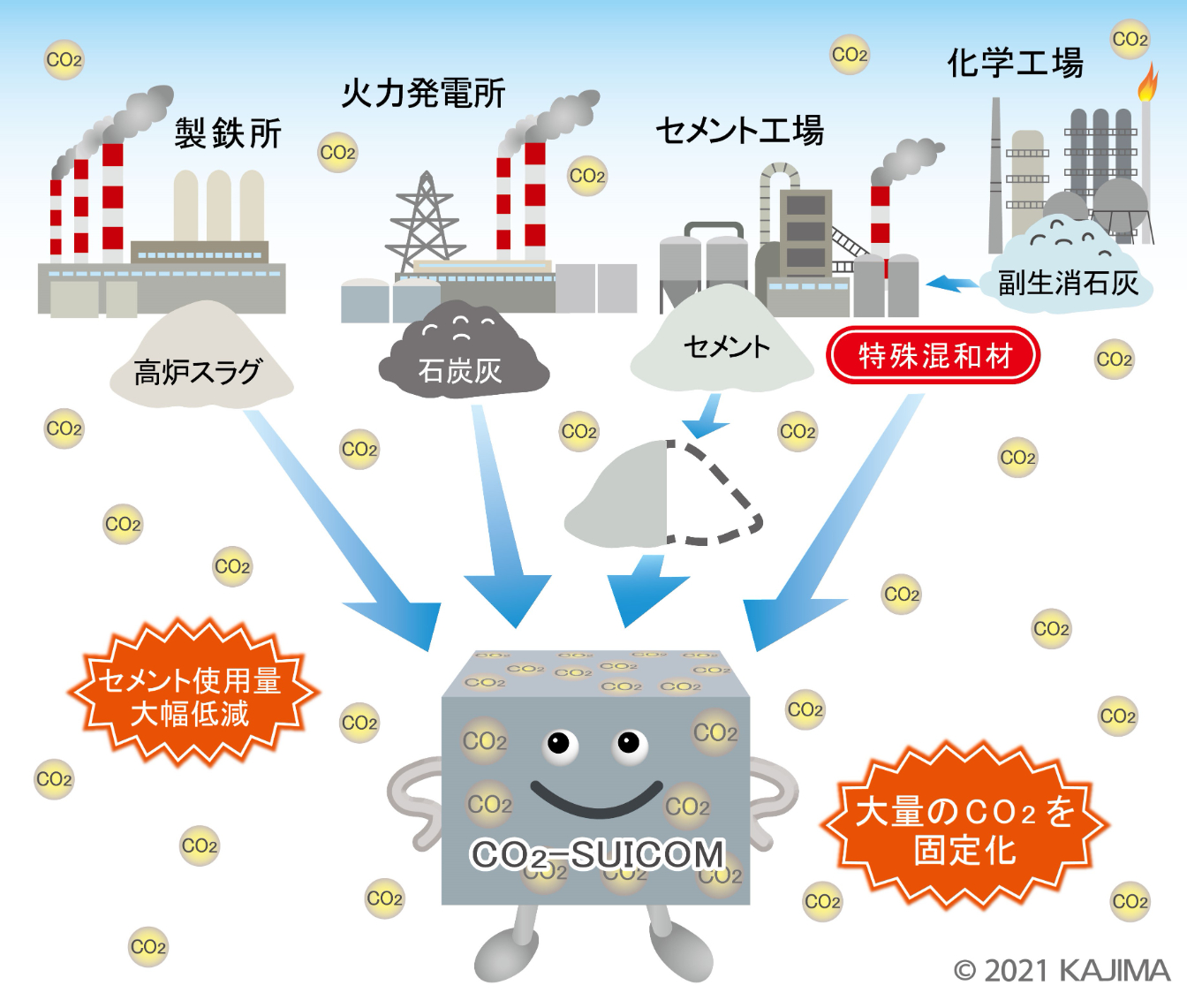 鹿島建設は2008年、製造過程におけるCO2排出がゼロ以下になるカーボンネガティブ型のコンクリートを世界で初めて開発、「CO2-SUICOM(シーオーツースイコム)」として実用化した。これまでに建築工事で使用される小型の舗装ブロックなどに使われるなど利用が広がっている。