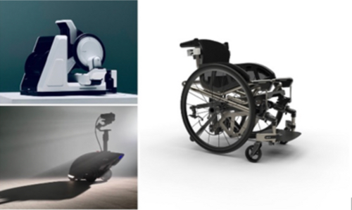 一般のユーザー向けに最適のシーティングを設計するシミュレーター(左上)、特別デザインの手動車いす(右)と歩行解析ロボット。 RDS 提供