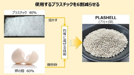 櫻井さんは以前に経営していたデザートの製造・販売会社で大量に廃棄していた卵殻に新素材としての可能性を見出した。卵殻を微粉砕しプラスチックの材料として60%混ぜれば、使用する樹脂を減らせるだけでなく、環境負荷を軽減し可燃ごみとして処理できる。