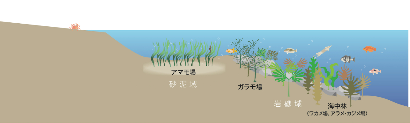 ブルーカーボン生態系の立役者は様々だ。沿岸の水深2m付近に生えるアマモなどの海草、熱帯のマングローブなどのほか、深いところで生育する大型海藻類のワカメ、アラメ、カジメなどもある。成長の早い大型海藻類は、とくにブルーカーボン増加に貢献する。海岸部の湿地や干潟なども炭素の貯留に重要な役割を持つ。