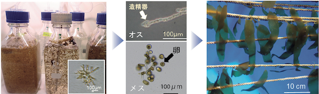 失われた藻場を再生するために、事前に採取した母藻から、海藻の種にあたる配偶体を培養する方法として、フラスコ内で浮遊状態にして増殖させる「フリー配偶体技術」を応用。配偶体からアラメ苗を大量につくる技術を確立させた。苗を移植する、胞子を散布するという手法と異なり、完全に消失した場を再生することができる。