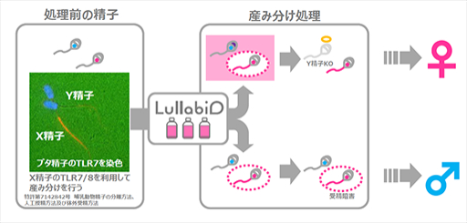 島田教授らの研究は、フローサイトメーターを使うことなく、哺乳類のX精子のみに存在する受容体と結合する薬剤を投入することで簡単にX精子とY精子を分離し、人工授精させる方法を可能にした。同社がその試薬の開発、製造、販売を担う。