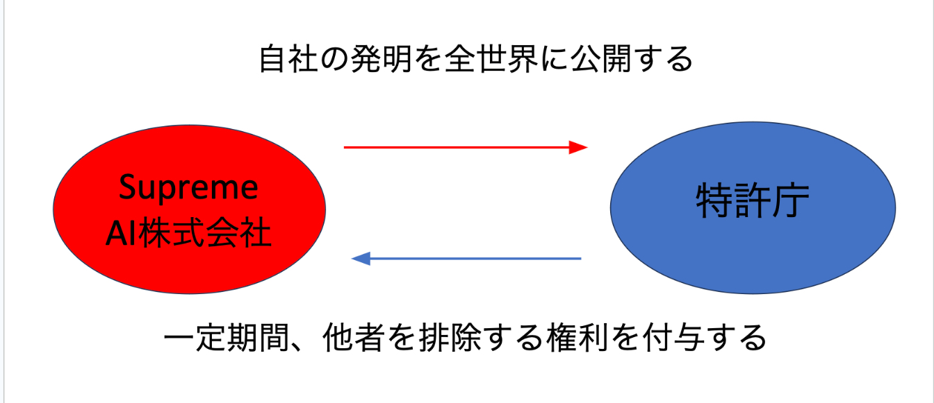特許を取得するため、Supreme AI社は自社の発明について特許権の取得を特許庁に申請しました。特許庁が日本、アメリカ、または他の国にあっても同じですが、特許の申請から18か月以内に出願の内容は全世界に公開され、競合他社を含む誰もがSupreme AI社の発明について読むことができるようになります。