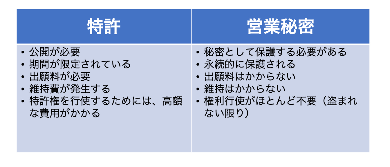 そのため、AIスタートアップが最初に決めるべき、最も重要なことの一つは、自社の重要な技術を特許で守るべきか、それとも営業秘密として守るべきかを判断することです。言い換えれば、