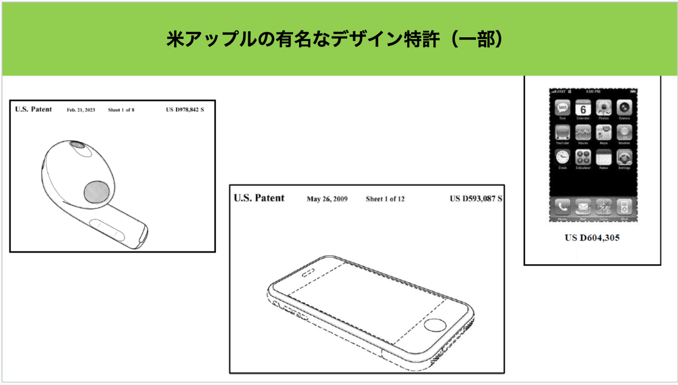 一部のAIスタートアップにとって、特許を取得して技術を守ることは効果的な方法の一つです。しかし、多くのAIスタートアップは、特許には目的に応じた複数の種類があることをあまり理解していないと思います。例えば、米国の特許法には「design patents(デザイン特許)」と「utility patents(実用特許)」があり、デザイン特許は製品の外観を保護し、デザインの独自性を守ります。デザイン特許と営業秘密の保護を組み合わせることで、公開する部分と秘密にする部分をうまく調整した保護が可能になります。図1には、米アップルの有名なデザイン特許の一部が示されています。