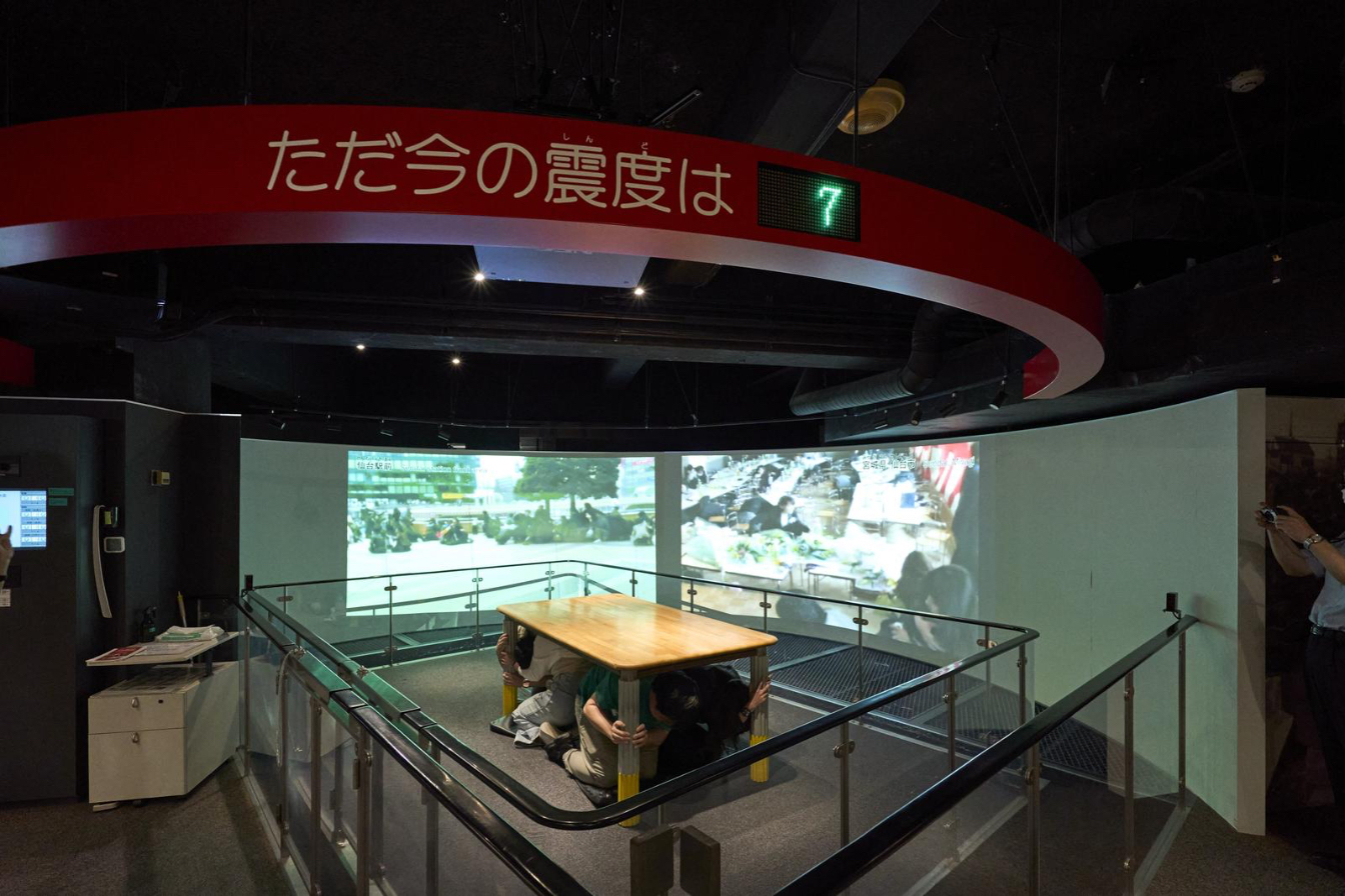 最後に行われた地震のシミュレーション体験では、参加者は揺れるステージの上に置かれた大きなテーブルの下に隠れるよう指示された。1回目のシミュレーションは、揺れが始まる前に日本の緊急地震速報が発令されたという想定。2回目のシミュレーションでは事前の警報がなく、揺れもより激しくなった。これは2011年の東日本大震災を再現したもので、スクリーンには当時の映像が映し出された。揺れは不規則で、少し収まったかと思うとまた揺れるという状況が続いた。