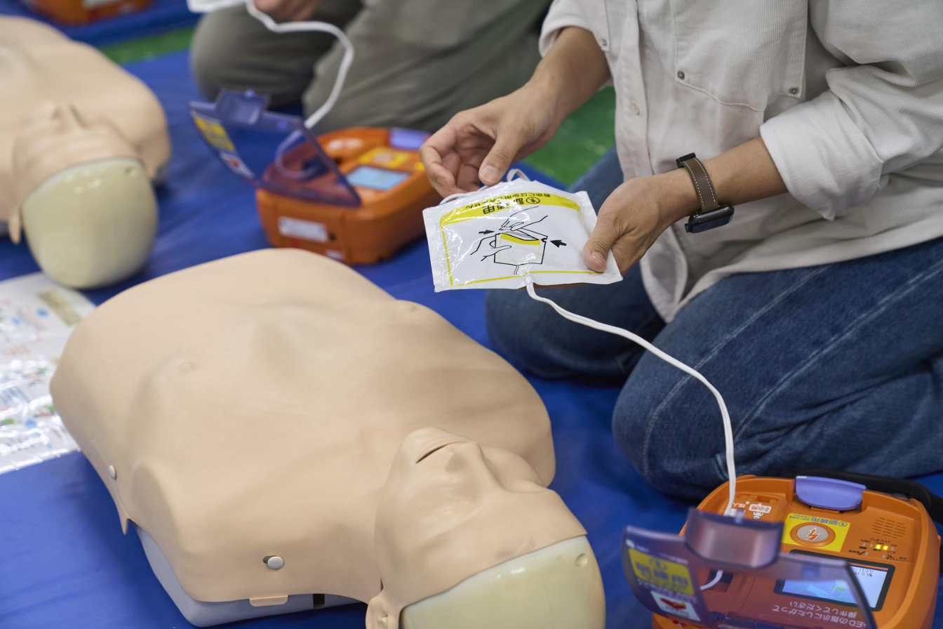 ツアーの最後には、応急処置のやり方を学ぶ。具体的には、心肺蘇生法(CPR)と自動体外式除細動器(AED)の使い方だ。