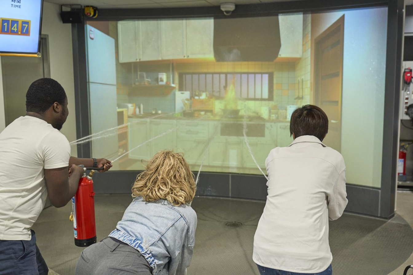 体験ツアーではまず、消火器の使い方と、炎上する建物からの避難方法を学ぶ。いずれも、日本だけでなく世界で通用するスキルだ。