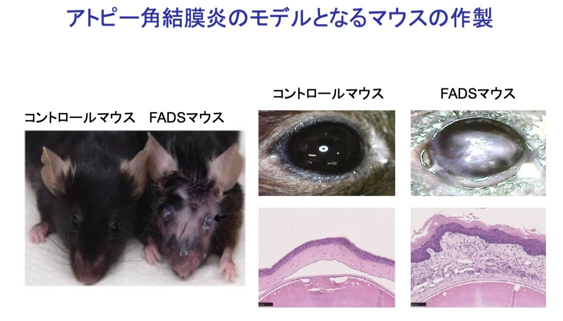 マウスの観察を始めると、「眼に病変を生じ、その病態がアトピー角結膜炎に似ており、これまで皮膚の痒みの原因物質として知られるタンパク質・ペリオスチンが多く現れていることが分かった」と出原さん。そこで遺伝子改変技術により、生まれつきペリオスチン遺伝子を持たないマウスを作成したところ、目の炎症や血管新生などの眼病変がほとんど見られず、病変が見られた場合も軽度という結果になり、ペリオスチンが眼病変の重要な原因であることがわかったという。