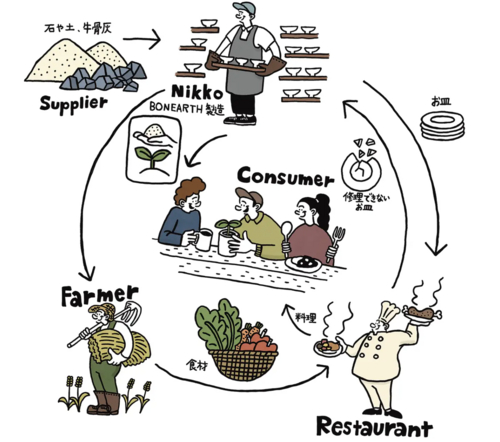 ボーンチャイナから生み出した肥料で農家が野菜を作る。その野菜をレストランが調理し、ボーンチャイナの皿で顧客に提供する。レストランのボーンチャイナが割れたりして使えなくなれば、新しい肥料として再生し、また野菜作りに活用する。ニッコーが思い描くボーンチャイナの循環型ビジネスでは、こんな形で洋食器メーカー、農家、レストラン、消費者がつながっていく。