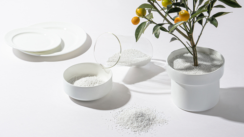 ボーンチャイナから作った真っ白な肥料は、土に混ぜて使うことはもちろん、土を隠すための化粧砂としても使用できるという。     ニッコー 提供