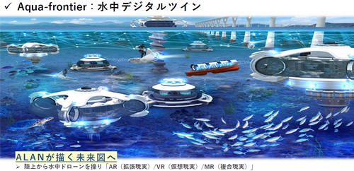 さらに、橋脚の傷や劣化などのインフラのモニタリング、水質管理、船底検査などにも力を発揮するほか、海に潜ることなく、陸上から海中散歩を楽しむ「水中デジタルワールド」の構想もある。