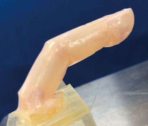 This is the first time that lab-grown skin has been applied to a 3D form such as a robot – in this case a finger with three joints. The skin is 1.5mm thick and has outer and inner layers corresponding to the epidermis and dermis of human skin. It has a soft and moist appearance, quite different to the silicon that has been used to coat humanoid robots to date.