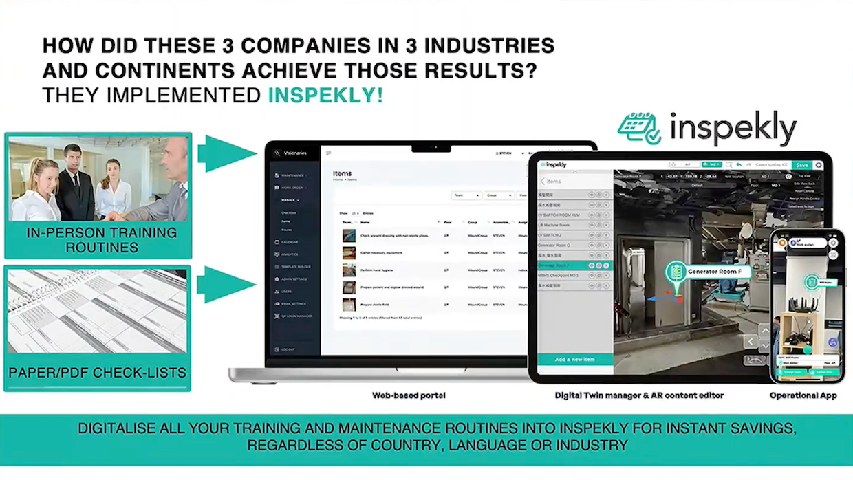 To address these challenges, Inspekly has developed facility management tools that leverage augmented reality (AR) technology. The company’s system creates digital twins of buildings and places virtual checklists to streamline employee training and maintenance operations.