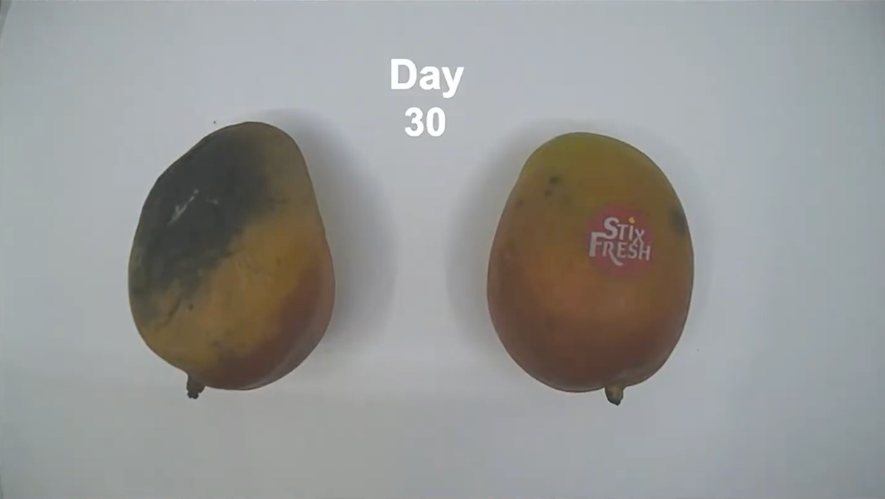 StixFRESH formulates natural components extracted from plants to food-safe standards, provided as stickers applied directly to fruit or small sachets packaged with food. The technology works in the vapor phase, meaning the stickers don’t need direct contact with the produce—instead, they release volatile compounds that create a protective “cloak” around the fruit, mimicking how plants naturally emit secondary metabolites to defend themselves against environmental threats.