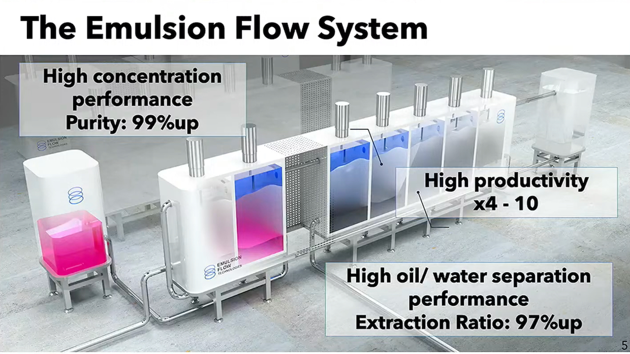 Emulsion Flow Technologies (EFT), a spinoff from the Japan Atomic Energy Agency, addresses these problems by establishing technology that creates water-oil emulsions through mechanical design and special solvent recipes, extracting specific materials from liquids with high purity and efficiency.