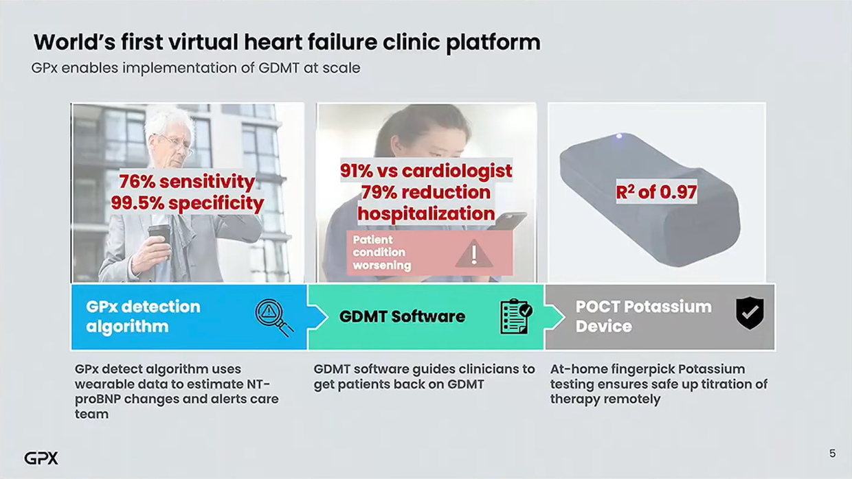 First, an algorithm that detects and predicts increases in NT-proBNP biomarkers, achieving 76% sensitivity and 99.5% specificity. This performance equals or exceeds that of implantable devices requiring surgical procedures.