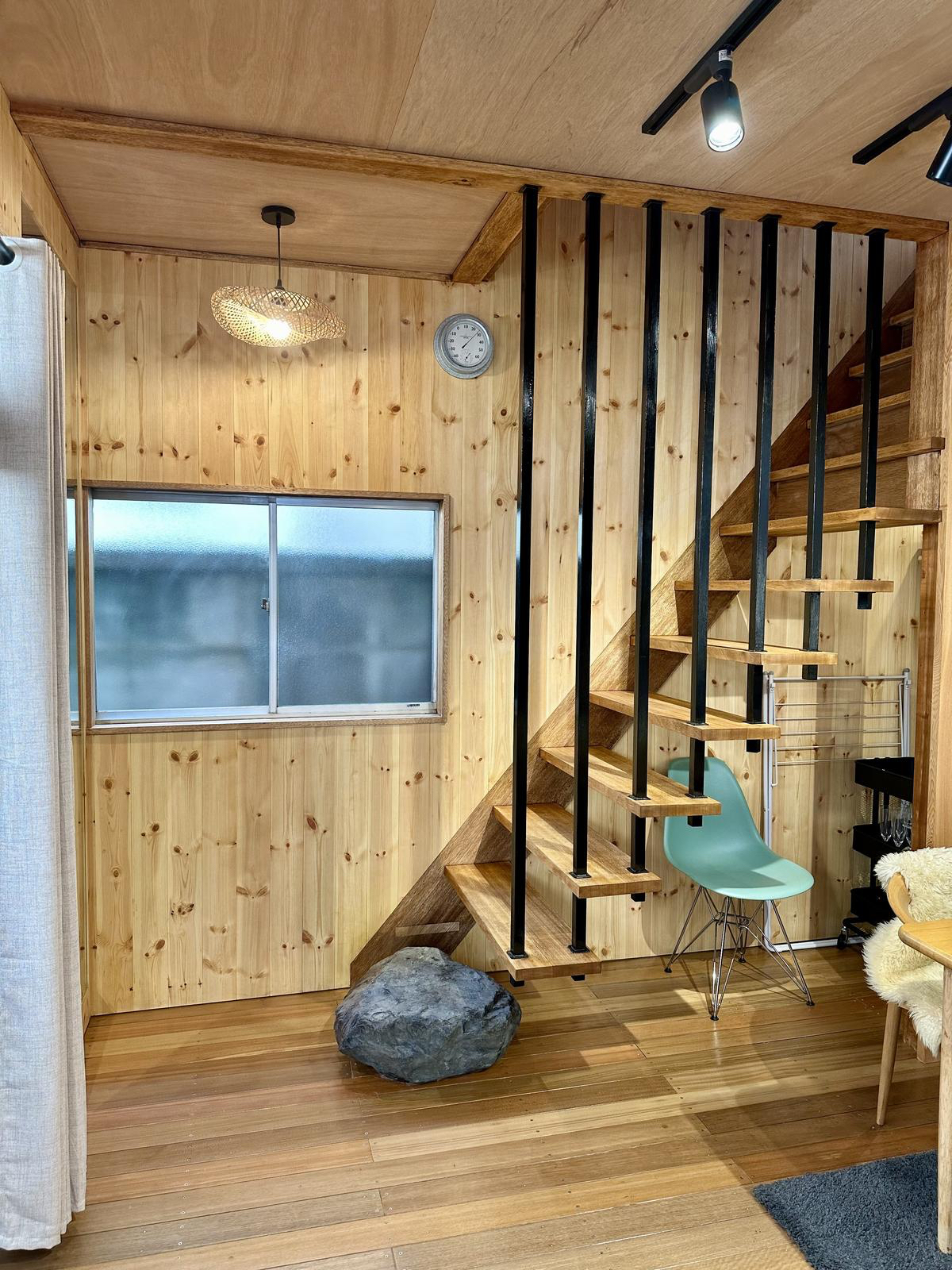 “The house is 53 years old. It was in shambles when I first saw it, probably having been left vacant for a long time. But I thought that, by tearing out the ceiling, I could create an open space, and by modifying the stair balusters, pillars, and vintage windows, it would become a wonderful space. It’s really fun to be able to make a run-down space look good by using your own ideas and techniques.”
