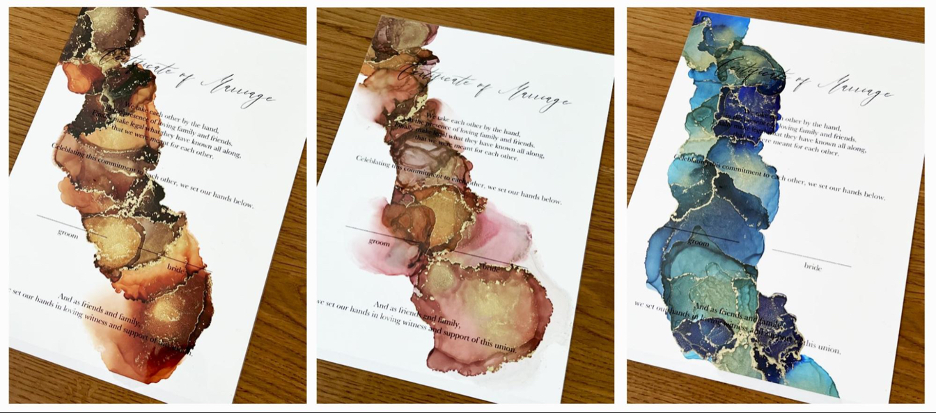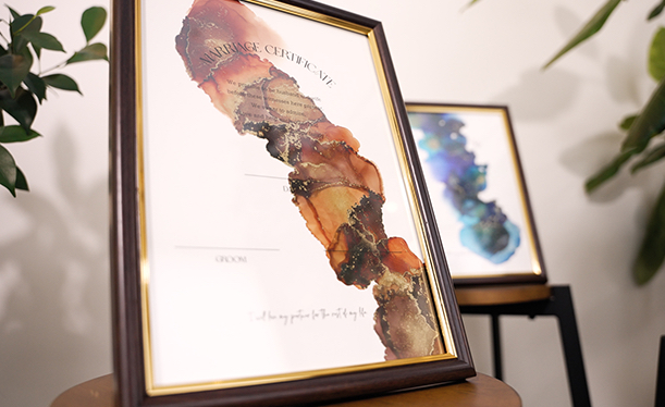同社の結婚証明書は3色のアルコールインクを使用したアート作品がもとになっており、A4の透明アクリルシートを重ねてふたりのサインを書き加えて完成する。 もともと海外で人気の高いアルコールインクアートは、インクなどをドライヤーなどの風で広げ、予測できない模様と色合いを楽しむものだ。