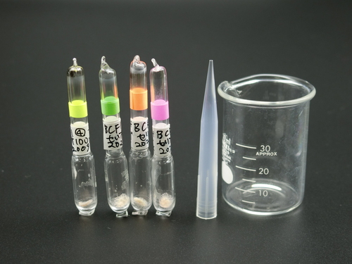 凍結乾燥した細胞を入れた4本のアンプルビン。右は 1ml の ピペットとビーカー。     山梨大学 提供