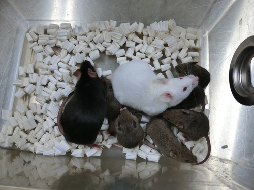 凍結乾燥した体細胞から生まれた黒いメスのクローンマウス(愛称は「ドラミ」)とその子供たち。白いマウスはドラミが交配した通常のマウス。      山梨大学 提供
