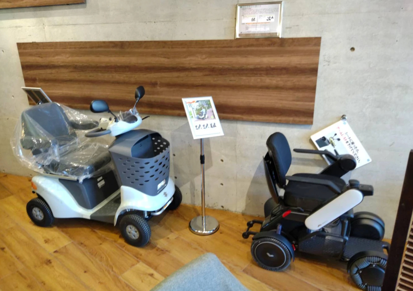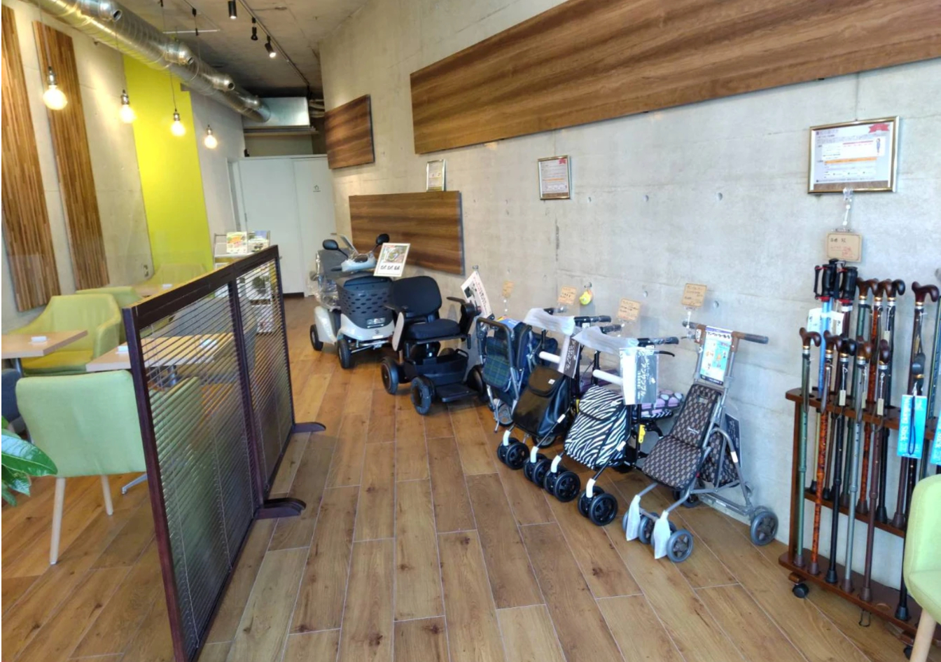 位於東京都荒川區,於2021年開設的咖啡店「Mobile Care & お茶 Cafe」。店內展示各種支援步行的輔具,包括數家公司生產的電動輪椅、助步以及各種設計的拐杖等,訪客可以試用與購買。