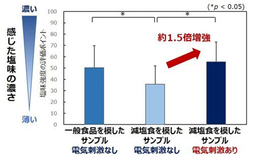 明治大学(東京中野区)(東京都中野區)宮下研究室與麒麟控股(キリンホールディングス,東京都中野區)透過共同研究開發的減鹽裝置「Eleki Salt(エレキソルト)」,利用對人體無害的極微弱電流,調節食品中構成鹹味與鮮味的離子運動,進而模擬出增強或減淡食物味道的效果。根據雙方共同研究的臨床試驗,全球首次證實,使用該裝置後,食用減鹽食品時所感受到的鹹味可增強約1.5倍。
