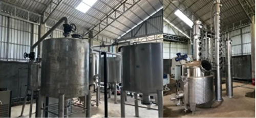 位於磅清揚省(Kampong Chhnang)的生物乙醇(Bioethanol)生產工廠。該工廠的每日生產能力為55公升,並生產燃料與消毒液。 圖片來源:Sunwesp 提供