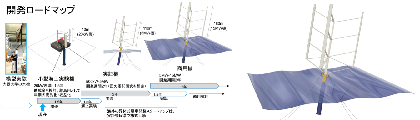 同社は2022年9月、ジェネシア・ベンチャーズ(東京都港区)から総額1億円の資金を調達した。浮遊軸型風車の小型実験機は2024年度に海上実験を開始する予定で、以降、2年ごとに大型機海上実験、実用化を目指している。