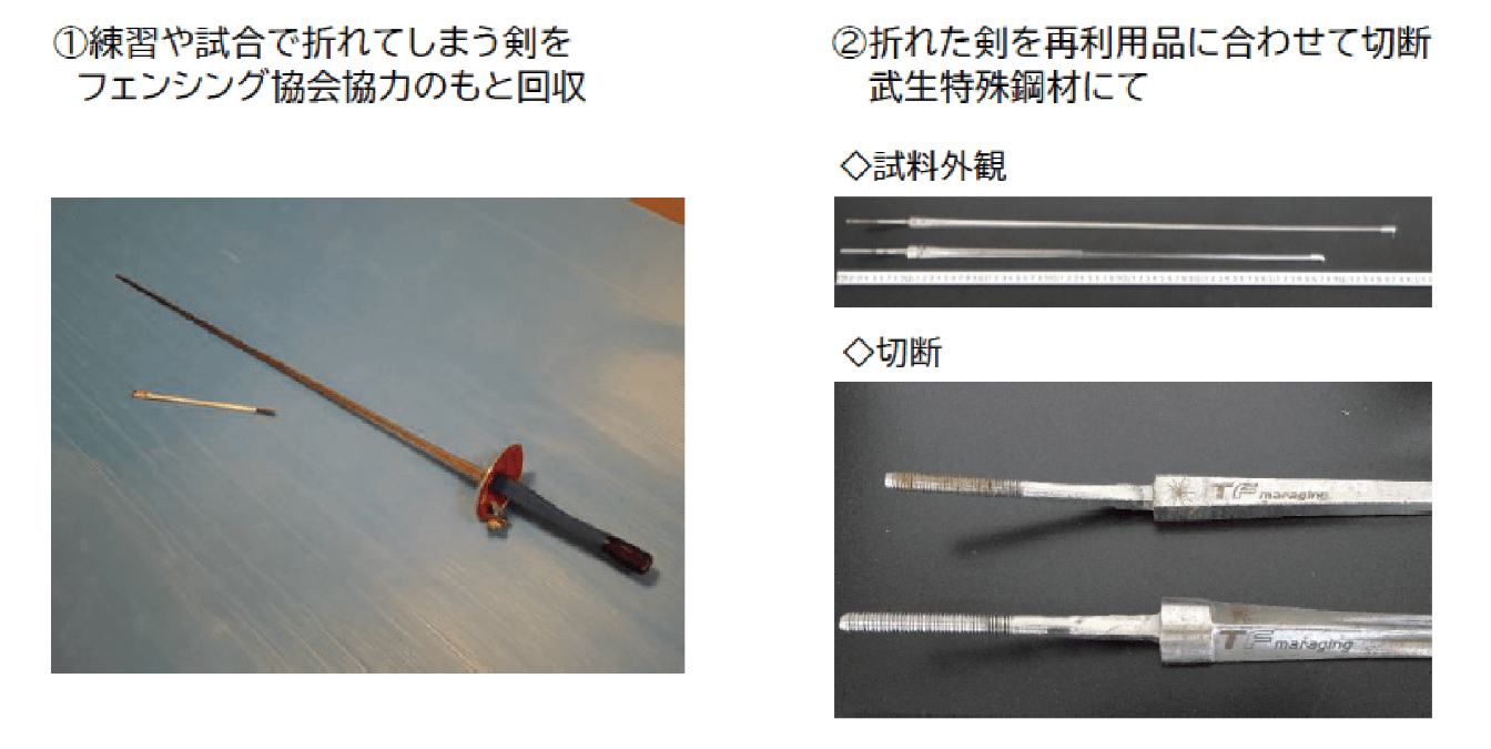 同社が折れた剣から包丁を試作したところ、切れ味に関わる硬度などの数値も使用可能な水準に仕上がった。今後は、ナイフや包丁、メダルへの加工を予定しており、将来的には日本で生産・加工が行われていないフェンシング剣への再生・再利用をめざしている。